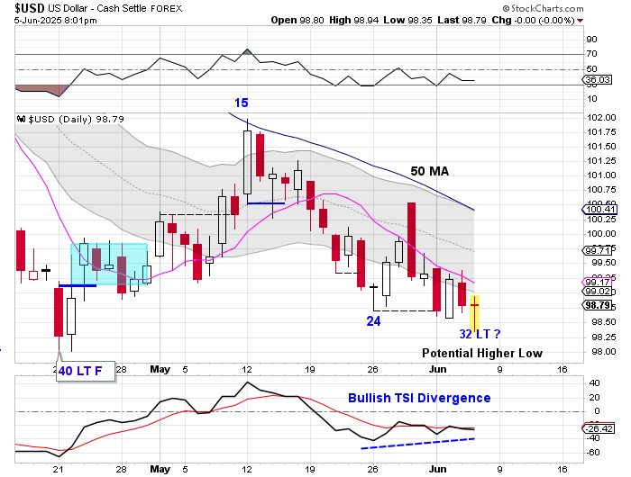 The dollar broke below the day 24 low on Monday to extend its daily cycle decline. The dollar is in the process of forming a bullish reversal on Thursday. Thursday is day 32, placing the dollar in its timing band for a DCL. The dollar is also overdue for an intermediate (weekly) rally. A swing low and a close above the 10 day MA will have us label day 32 as the DCL.