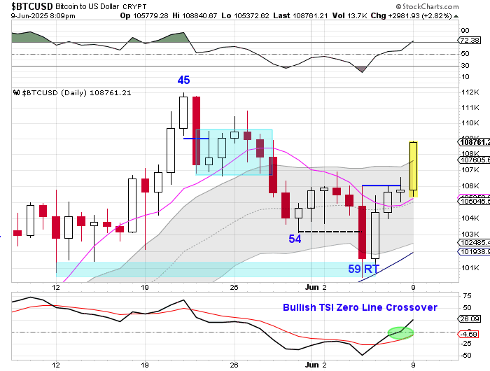 was day 59, placing Bitcoin deep in its timing band for a DCL. Bitcoin found support at the rising 50 day MA on Friday then closed above the 10 day MA on Saturday. Bitcoin delivered bullish follow through by forming a swing low on Sunday and rallying higher on Monday, so we will label day 59 as the DCL. Bitcoin is currently in a daily uptrend. Bitcoin will remain in its daily uptrend unless it closes below the lower daily cycle band.