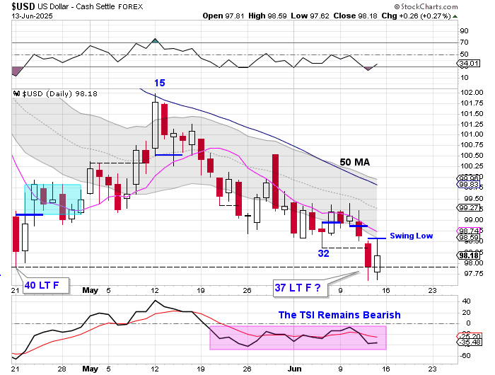 The dollar broke below the day 32 low on Thursday to extend its daily cycle decline. The dollar also broke below the previous DCL on Thursday. Breaking below the previous DCL forms a failed daily cycle and extends the dollar’s intermediate cycle decline. Thursday was day 37, placing the dollar very deep in its timing band for a DCL. The dollar formed a swing low on Friday. A close above the 10 day MA will have a us label day 37 as the DCL. The dollar is currently in a daily downtrend. The dollar will remain in its daily downtrend unless it closes back above the upper daily cycle band