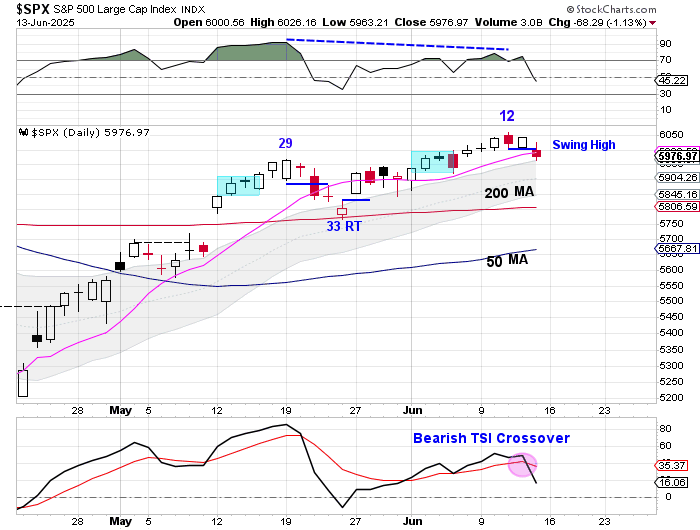Stocks formed a swing high and closed below the 10 day MA on Friday. Friday was day 14 for the daily cycle. Any bearish follow through will set up a potential left translated daily cycle formation. Stocks are currently in a daily uptrend. They will remain in their daily uptrend unless they close below the lower daily cycle band.