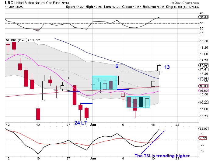 Natgas had been coiling below the 10 day MA — until Monday. Natgas broke bullishly out of consolidation on Monday to close above both the 10 day MA and the 200 day MA. Nagas delivered bullish follow through on Tuesday by closing above the 50 day MA and the upper daily cycle band. Closing above the upper daily cycle band ends the daily downtrend and begins a new daily uptrend. Closing above the upper daily cycle band also signals that the intermediate cycle low has been set — which I plan to discuss further in the Weekend Updates.