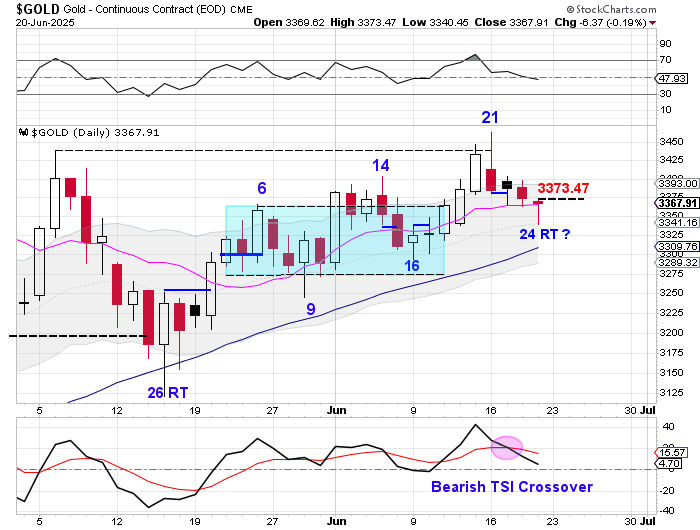 Friday was day 24, placing gold in its timing band for a daily cycle low. Gold should close below the 10 day MA and turn it lower in order to complete its daily cycle decline. However gold formed a bullish reversal on Friday, easing the parameters for a swing low. Gold is currently in a daily uptrend. If gold forms a swing low and closes above the 10 day MA that will indicate a continuation of its daily uptrend and signal a cycle band buy signal — in which we would then label day 24 as the DCL. A break above 3373.47 will form a swing low.