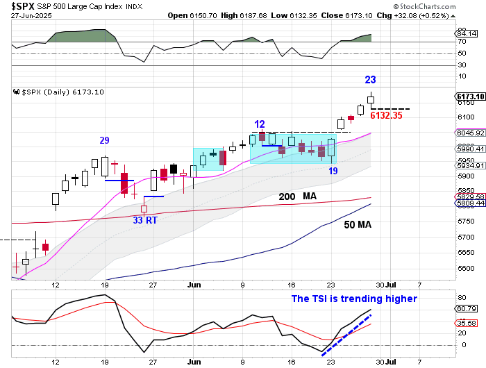 Stocks broke out to a new all-time high on Friday. Stocks are now quite stretched above the 10 day MA. Stocks may need to consolidate in order to allow the 10 day MA time to catch up to price. However, Friday was day 23, placing stocks in the early part of their timing band for a DCL. A break below 6132.35 will form a swing high. Then a close below the 10 day MA will signal the daily cycle decline. Stocks are currently in a daily uptrend. They will remain in their daily unless they close below the lower daily cycle band.