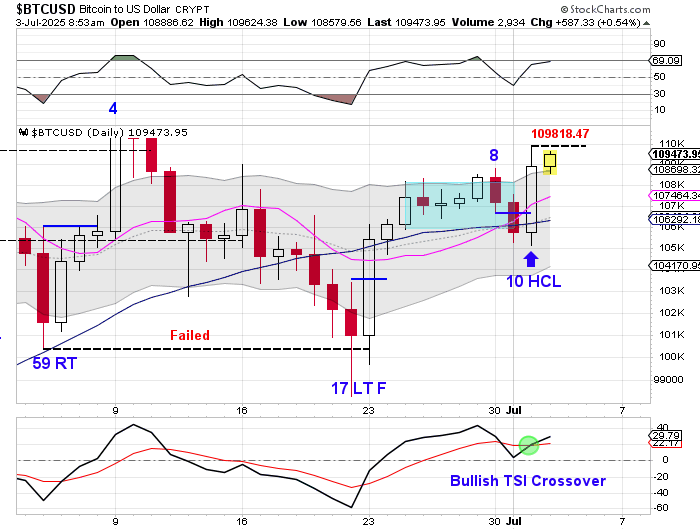Bitcoin formed a swing high and closed below the converging 50 day MA and 10 day MA on Tuesday to set up a potential left translated daily cycle formation. Bitcoin did not deliver any bearish follow through on Wednesday. Instead Bitcoin delivered a bullish surprise. Bitcoin rallied and closed above both the 50 day MA and the 10 day MA, as well as breaking out to a new daily cycle high. Bitcoin is currently in a daily uptrend. If Bitcoin forms a swing low that will indicate a continuation of its daily uptrend and signal a cycle band buy signal. A break above 109818.47 will form a swing low.
