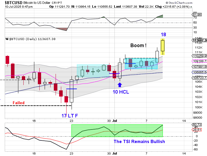 Bitcoin has been consolidating below the 110000 level — until Wednesday. Bitcoin broke bullishly out of consolidation on Wednesday and delivered bullish follow through on Thursday. The new high on day 18 shifts the odds towards a right translated daily cycle formation. Bitcoin is currently in a daily uptrend. Breaking bullishly out of consolidation indicates a continuation of its daily uptrend and signals a cycle band buy signal.