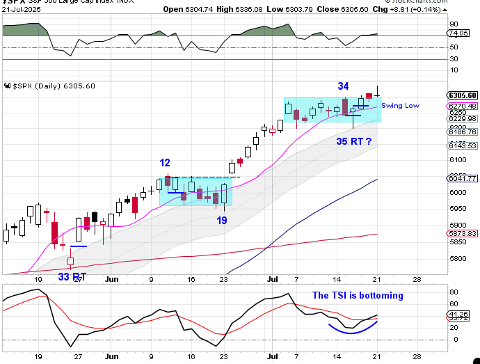 Stocks did breakout and closed at a new all-time high. However, stocks formed a bearish reversal and there are bearish divergences developing on the oscillators which questions if day 35 was the DCL. A swing high with a close back in the trading box will signal that stocks are declining into their daily cycle low.