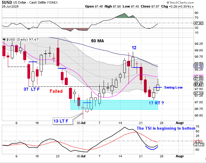 The dollar formed a swing low on Friday. The dollar printed its lowest point on Thursday day 17, placing it in the early part of this timing band for a DCL. Friday’s swing low signals a new daily cycle. We will use a close above the 10 day MA to label day 17 as an early DCL. The dollar is currently in a daily downtrend. The dollar will remain in its daily downtrend unless it closes above the upper daily cycle band.
