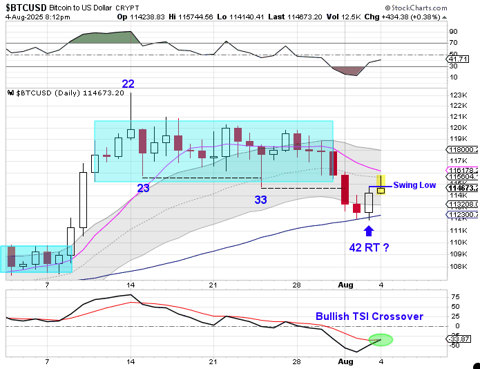 Bitcoin broke bearishly out of consolidation on Friday to signal the daily cycle decline. Bitcoin found support at the rising 50 day MA on Sunday, day 42 — placing it in its timing band for a DCL. Bitcoin formed a swing low on Monday. A close above the 10 day MA will have us label day 42 as the DCL. Bitcoin is being squeezed by the declining 10 day MA and the rising 50 day MA. Resolution of this consolidation should result in a trending move.