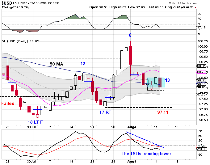 The dollar closed below both the 10 day MA and 50 day MA last Wednesday. Dollar has since been finding support at the 98 level. The current peak on day 6 indicates a left translated daily cycle formation. Notice that the 10 day MA has started to turn lower. A bearish break out of consolidation will signal the daily cycle decline. Then, a break below the previous DCL of 97.11 will form a failed daily cycle.
