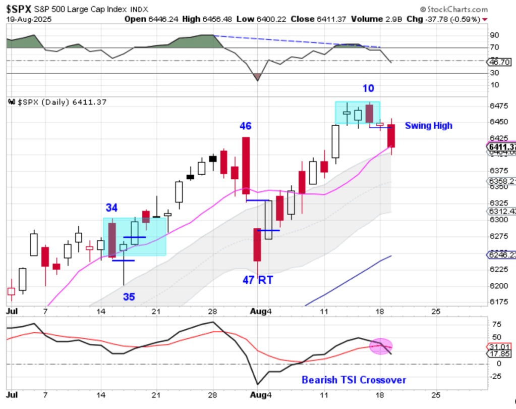 Stocks formed a swing high on Monday then closed below the 10 day MA on Tuesday. A peak on day 10 sets up a possible left translated daily cycle formation. If stocks deliver bearish follow through that will signal the daily cycle decline.