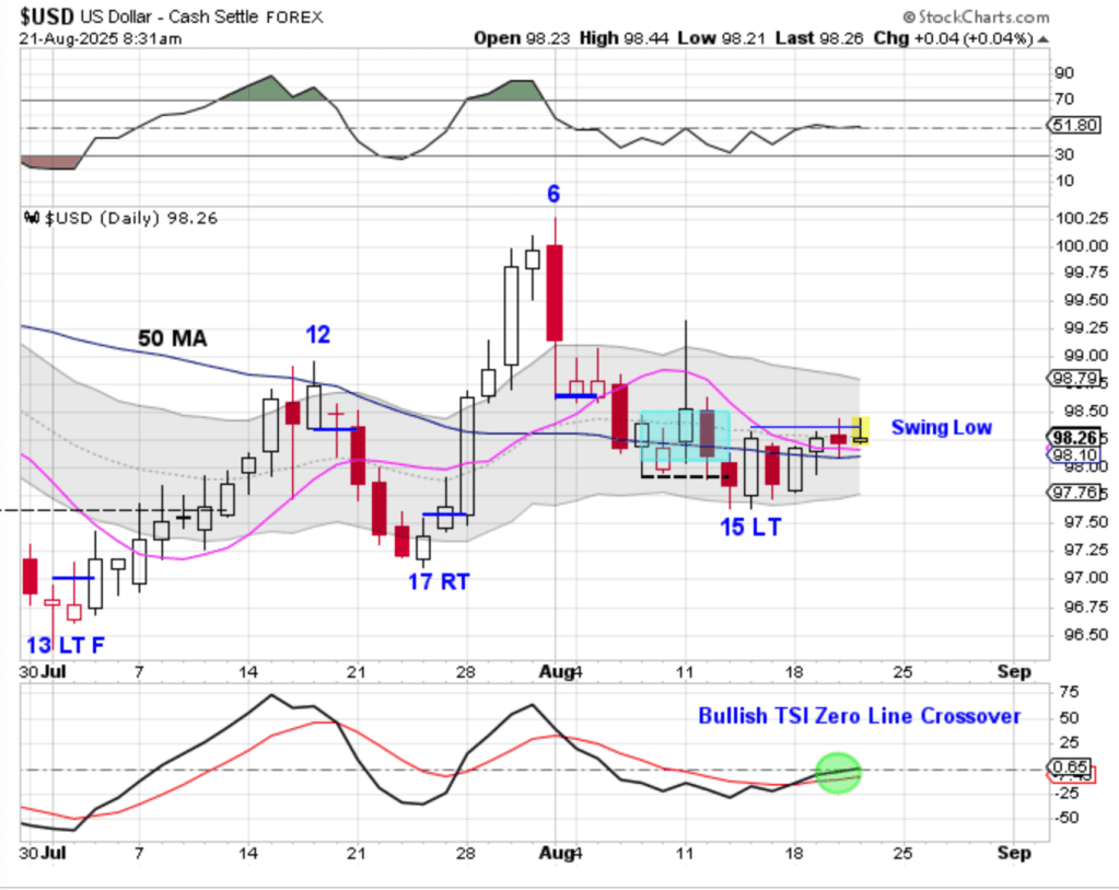 The dollar broke below the 98 support level last week. However, the dollar did not deliver bearish follow through. Instead the dollar rallied to close back above the 50 day MA last Thursday. The dollar closed above the 10 day MA on Tuesday then formed a swing low on Wednesday. The dollar is currently in a daily uptrend. Forming a swing low and closing back above the 10 day MA indicates a continuation of its daily uptrend and signals a cycle band buy signal. So we will label day 15 as an early DCL.
