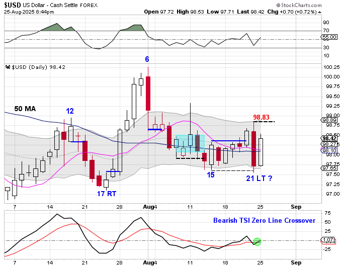 The dollar formed a bearish reversal and closed below both the 10 day MA and the 50 day MA on Friday to signal the daily cycle decline. Friday was day 21, placing the dollar in the early part of its timing band for a DCL. The dollar did not deliver bearish follow through on Monday. Instead, the dollar delivered a bullish surprise by closing back above both the 10 day MA and the 50 day MA. The dollar is currently in a daily uptrend. If the dollar forms a swing low, that will indicate a continuation of its daily uptrend and signal a cycle band buy signal — in which we would then label day 21 as the DCL. A break above 98.83 will form a swing low.