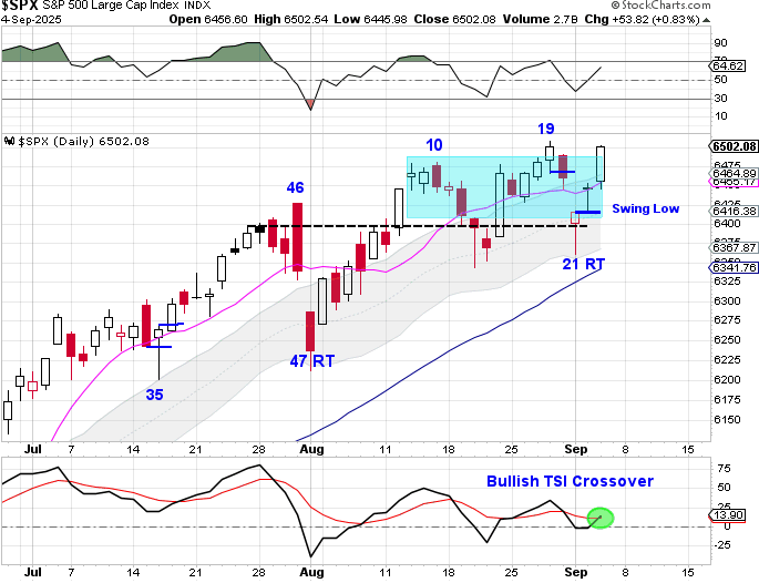 Stocks printed their lowest point on day 21, which is early to expect a DCL to form. However, stocks did not deliver bearish follow through on Wednesday. Instead, stocks found support at the 6350 level and formed a swing low and closed back above the 10 day MA. Stocks went on to deliver bullish follow through on Thursday. Stocks are currently in a daily uptrend. Closing back above the 10 day MA indicates a continuation of its daily uptrend and signals cycle band buy signal — so we will label day 21 as an early DCL.