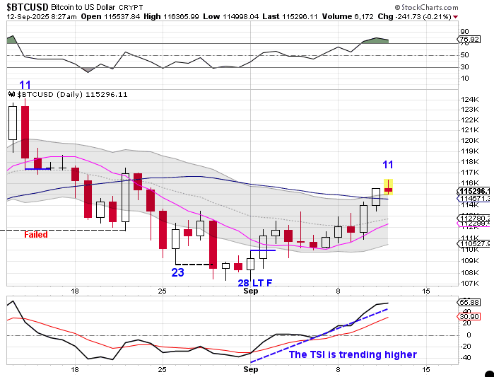 Bitcoin had been consolidating in-between the 10 day MA and the 50 day MA — until Thursday. Bitcoin closed above both the 50 day MA and the upper daily cycle band on Thursday. Closing above the upper daily cycle band ends its daily downtrend and begins a daily uptrend. Closing close above the upper daily cycle band also signals that the intermediate cycle low has been set — which I plan discuss further in the Weekend Updates.