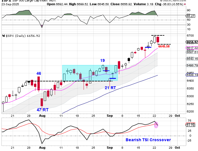 Stocks ran into resistance at the 6700 level on Monday and formed a bearish reversal on Tuesday. Stocks were getting a bit stretched above the 10 day MA. Stocks may need to consolidate in order to to allow the 10 day MA time to catch up to price. But a swing high with a close below the 10 day MA will signal the daily cycle decline. Stocks are currently in a daily uptrend. Stocks will remain in their daily uptrend unless they close below the lower daily cycle band.