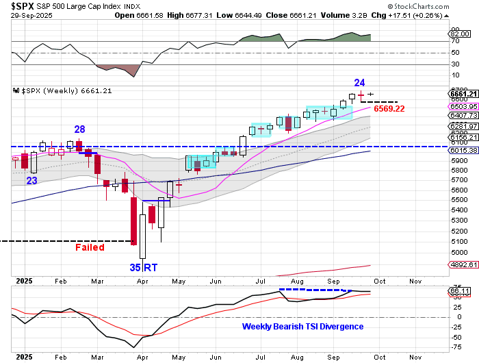 This is week 25 for the intermediate cycle, placing stocks in their timing band for an ICL. We will need to see a weekly swing high with a close below the 10 week MA to signal the intermediate cycle decline. A break below 6569.22 will form a weekly swing high. Stocks are currently in a weekly uptrend. Stocks will remain in their weekly uptrend unless they close below the lower weekly cycle band.