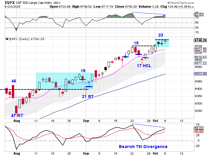 Stocks continues to stair-step higher. Stocks are a bit stretched above the 10 day MA. Stocks have begun to consolidate below the 6750 level, which should help to allow the 10 day and a time to catch up the price. Stocks are in a daily uptrend. A bullish break out of consolidation will indicate a continuation of its daily uptrend and signal a cycle band buy signal. A bearish break out of consolidation with a close below the 10 day MA will signal the daily cycle decline.