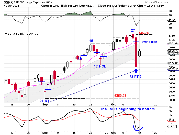 After dropping 2.71% on Friday to signal the daily cycle decline, stocks rallied on Monday. Friday was day 28, placing stocks in their timing band for a DCL. Stocks closed below the 10 day MA and turned the 10 day MA lower on Friday so technically stocks “did enough” for a DCL to form. Stocks will need to form a swing low and close back above the 10 day MA in order to label day 28 as the DCL. Stocks would have to rally another 1.62% to break above the day 28 high of 6762.40 in order to form a swing low. So, if day 28 ends up being the DCL, there was a longer term concern that developed on Friday. Stocks closed below the lower daily cycle band on Friday. Closing below the lower daily cycle band ends the daily uptrend and begins a daily downtrend. Closing below the lower daily cycle band also indicates that intermediate cycle decline has begun — which is something that I plan to discuss in the Weekend Report.
