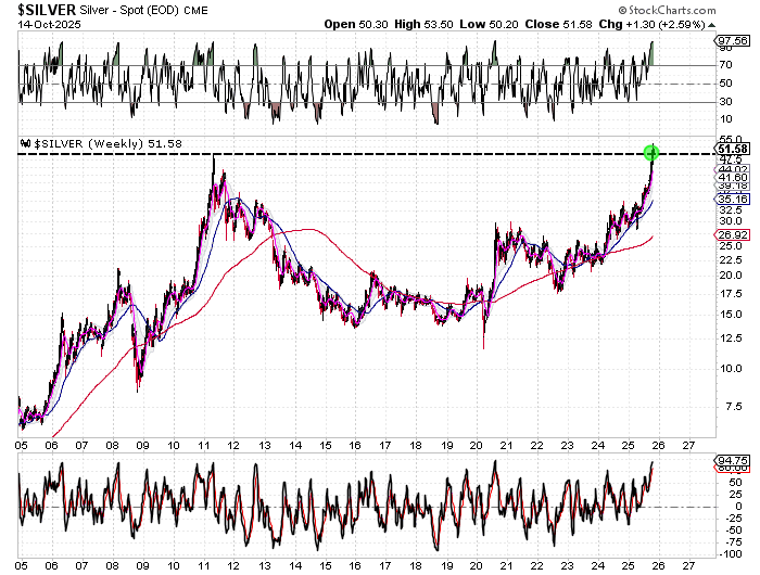 Now, silver looks ready to join the move. Silver is breaking above its long-term resistance zone — the same level that capped rallies in both 1980 and 2011. Bullish follow through here would mark a major technical milestone and likely ignite the next leg higher for the entire precious metals complex.