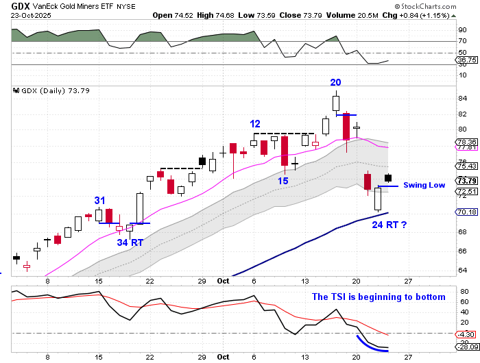 The Miners remain in a daily uptrend. A close above the 10 day MA will indicate a continuation of that uptrend and trigger a cycle band buy signal. However, if day 24 does turn out to be the DCL, there’s a larger concern developing at the intermediate cycle level — which I’ll be covering in detail in the Weekend Report.