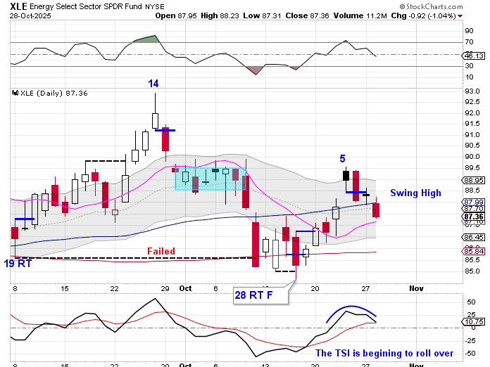 XLE formed a swing high on Friday and then delivered bearish follow through on Tuesday, closing below the 50 day moving average. That close sets up the potential for a left-translated daily cycle formation, suggesting the recent rally may have already peaked early within the cycle.