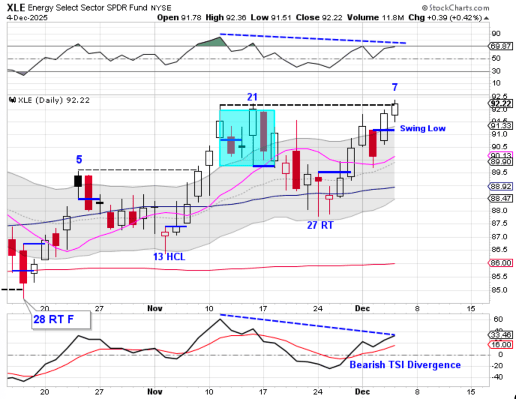 However, XLE remains in a daily uptrend, and the bulls still control the tape. A decisive breakout above 92 would confirm continuation of the uptrend and trigger a cycle band buy signal.