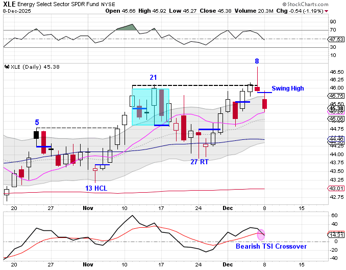 - XLE broke above 46.50 on Friday but reversed into a bearish close.