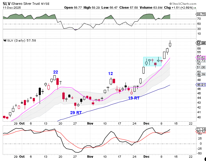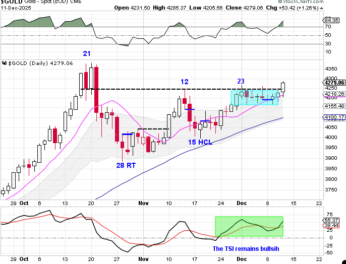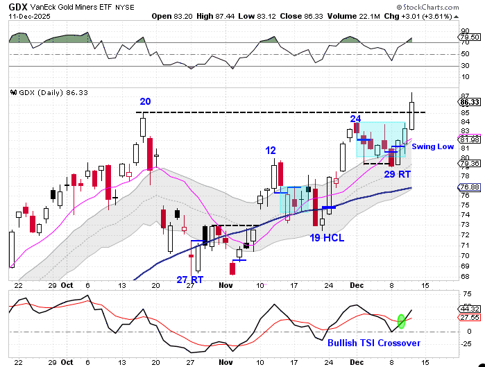 Both gold and the Miners had been coiling beneath their respective resistance levels — until Thursday. On Thursday, both markets broke decisively out of consolidation, launching bullish continuation moves. Gold and the Miners are each in a daily uptrend. Their breakouts signal further continuation of the uptrend and generate cycle band buy signals for both markets. Stops can be set below the breakout.