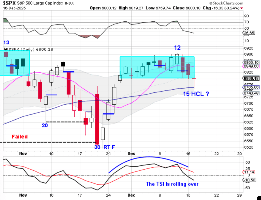 Stocks broke bearishly out of consolidation on Tuesday, day 15, confirming downside pressure and reinforcing the risk of a left-translated daily cycle formation. However, sellers ran into immediate support at the rising 50 day moving average, where stocks formed a reversal candle into the close.