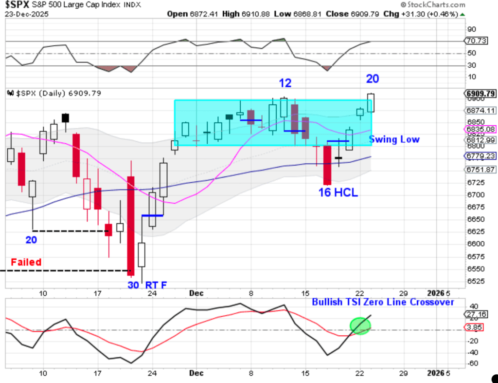 Tuesday’s breakout to a new all-time high is technically important. A new high occurring on day 20 confirms a right translated daily cycle, which aligns with stocks being firmly in a daily uptrend. This type of cycle behavior is exactly what we expect to see when trend strength is healthy and sustained. Breaking out to a new all-time high also signals a cycle band buy signal, reinforcing that the daily uptrend remains intact and in control. As long as stocks continue to hold above key short-term moving averages, the path of least resistance remains higher.