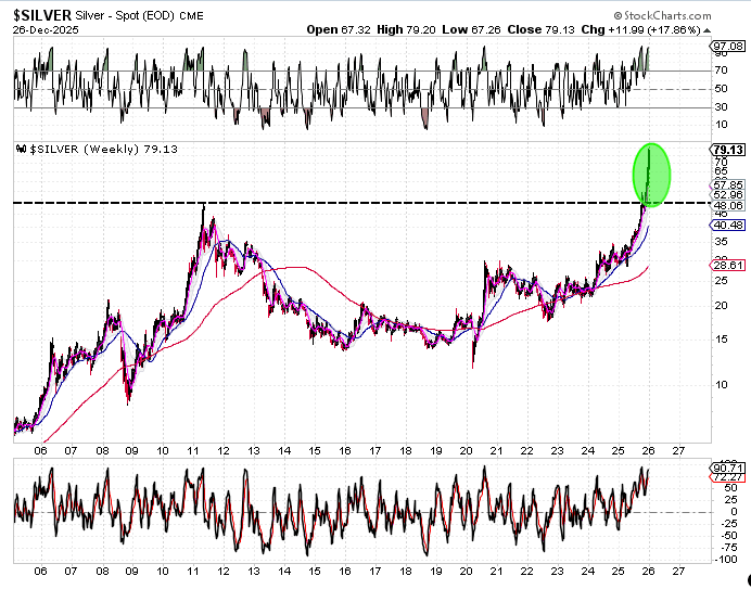 What’s notable now is that copper — while not a precious metal — appears to be joining the move. Copper often acts as a confirmation signal for broader cyclical strength, particularly when participation begins to expand beyond the traditional precious metals complex. Its improvement suggests increasing risk appetite and reinforces the idea that the broader metals space is in a sustained advance.