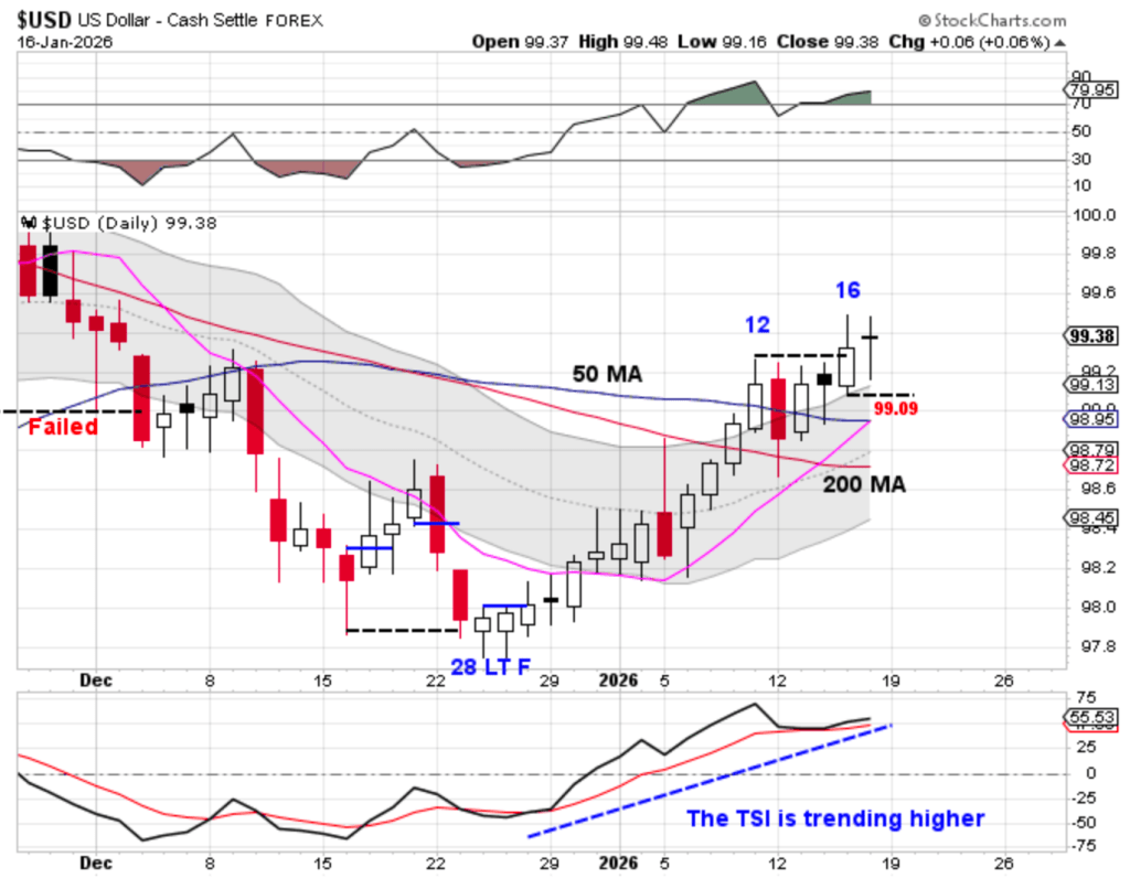 The dollar is currently extended above the 10 day moving average, suggesting near-term consolidation may be needed to allow the short-term average to catch up to price. That said, price action remains constructive, and no technical damage has occurred.