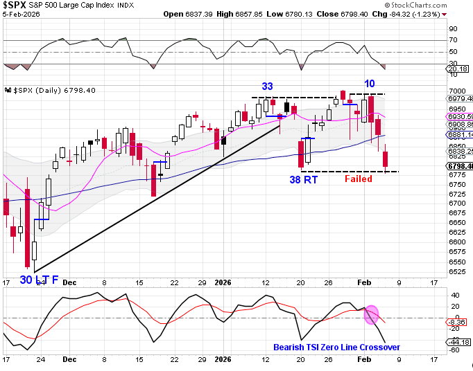 Stocks were rejected at the 7000 resistance level and closed below the 10 day moving average on Tuesday, day 10. That rejection was followed by consecutive lower closes on Wednesday and Thursday. On Thursday, stocks broke below the 50 day moving average and undercut the day 38 low. Breaking below the day 38 low forms a failed daily cycle and signals that the intermediate cycle decline is now in progress.