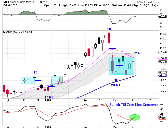 Late last week, the Miners closed below the lower daily cycle band, which ended the daily uptrend and began a daily downtrend. However, that breakdown has now been fully negated.