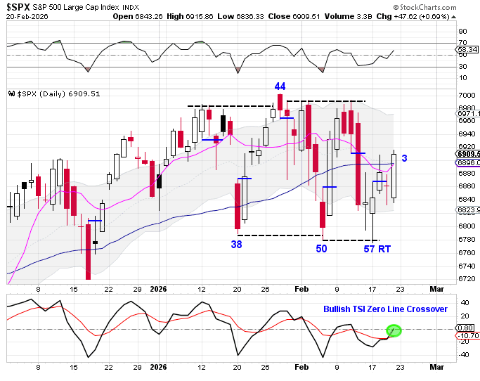 Instead, buyers defended the 6800 level, producing a bullish reversal. That reversal was followed by a swing low and a close back above the converging 10 day moving average and 50 day moving average, which also turned the 10 day moving average higher to confirm Tuesday as the Daily Cycle Low — 57 RT, signaling the start of a new daily cycle.