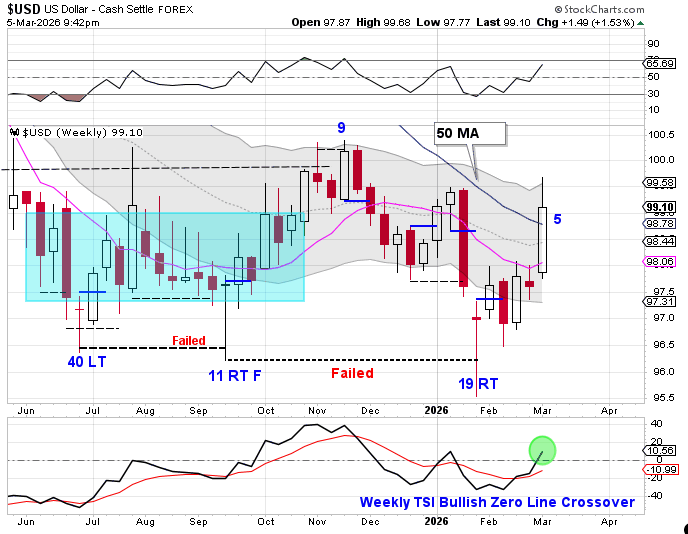 Barring some type of sharp reversal into the weekly close, the Dollar should finish the week above the 10 week moving average, which would allow us to label week 19 as the Intermediate Cycle Low. That would make the current advance week 5 of the new intermediate cycle.