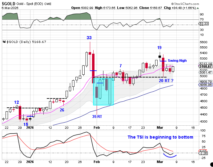 - Gold appears to be working through a daily cycle decline after forming a swing high and closing below the 10 day moving average.