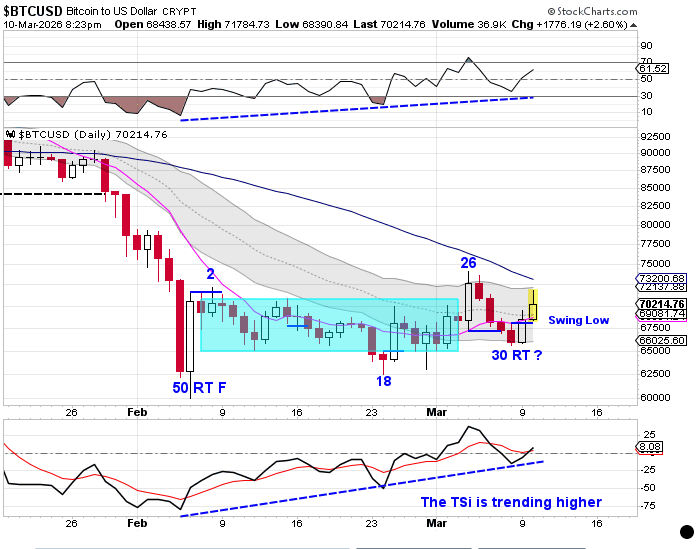 • BTC formed a swing low and closed above the 10 day moving average on Monday.