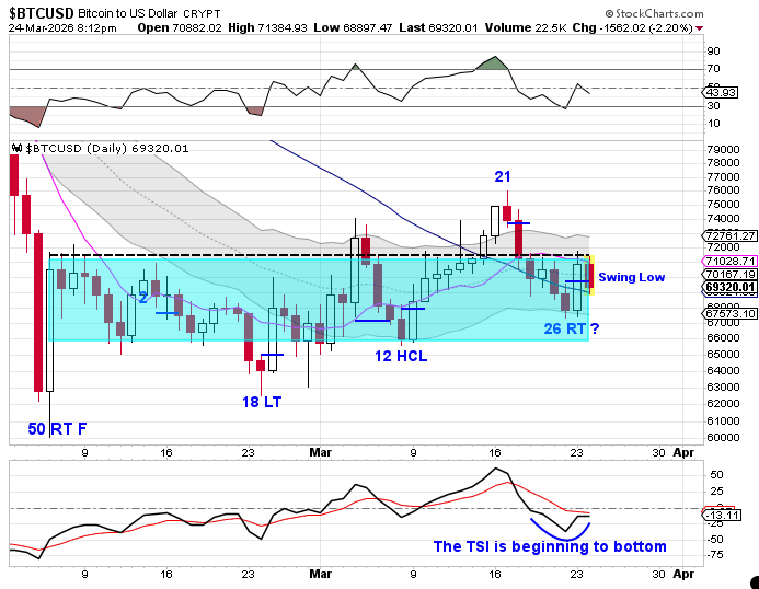 What is clear is that BTC is attempting to turn — but has not yet confirmed it. From a cycle perspective, the setup is constructive. The timing window is open, and a swing low is in place. But confirmation requires follow-through. A close above both the 10 day moving average and the 72,000 resistance level will be needed to confirm that a daily cycle low is in place. That signal would indicate continuation of the daily uptrend. Until then, BTC remains in consolidation, with resistance still defining the near-term trend.