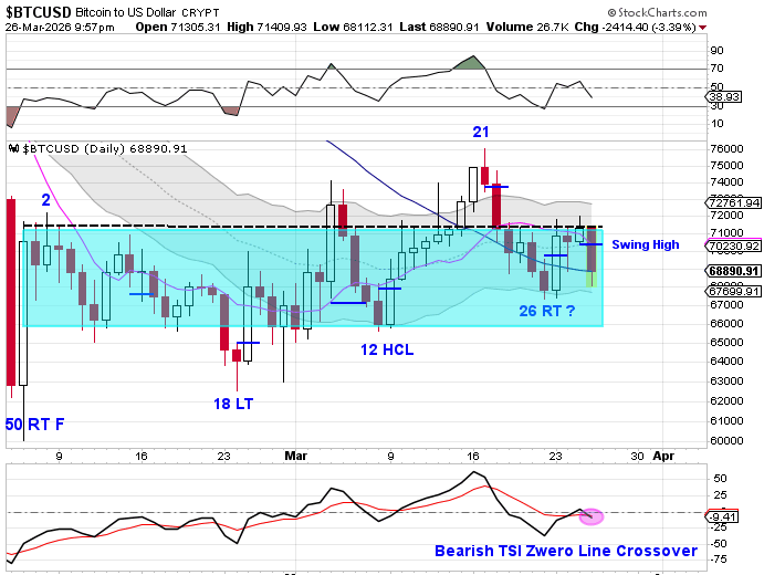 BTC formed a swing high and closed back below the 10 day moving average, effectively negating the initial confirmation signal. This type of reversal is important, as it introduces uncertainty into the cycle structure and raises the possibility that the decline is not yet complete.