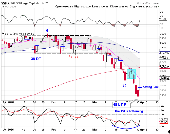 Stocks printed their lowest point on Monday, day 48, placing them deep in their timing band for a daily cycle low. A swing low and close above the 10 day moving average confirmed day 48 as the DCL. Both timing and confirmation are now in place. From a cycle perspective, this marks the start of a new daily cycle. However, the 10 day moving average dropped sharply into the low, suggesting the market may need to consolidate before it can turn higher.