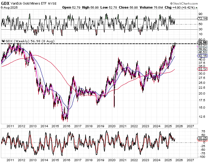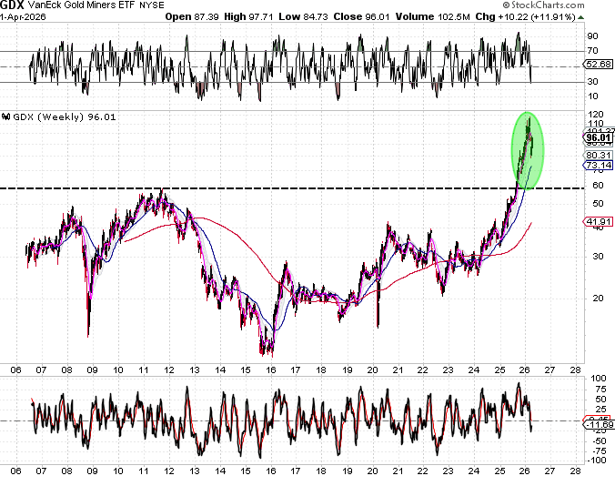The Miners broke out after a 15-year consolidation and rallied approximately 95% before rolling into their intermediate cycle decline.