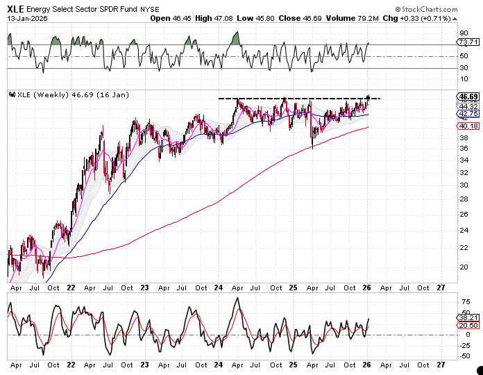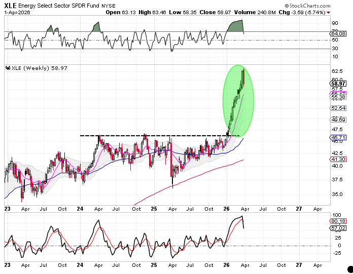 And most recently, XLE adds a current example. XLE consolidated for approximately two years before breaking out in January, rallying roughly 37%. It is now pulling back and may have begun its intermediate cycle decline, reinforcing the same structural sequence. What is consistent across all of these examples is not the magnitude of the move, but the structure.
