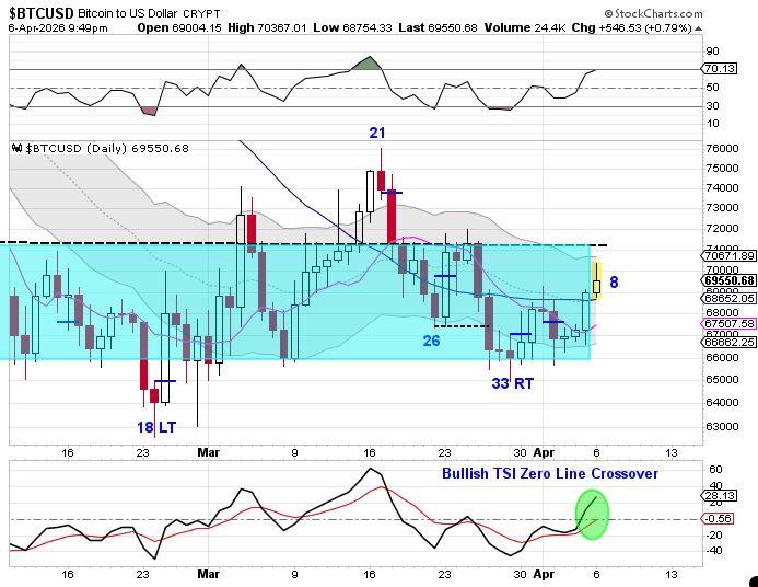 BTC is now delivering bullish follow through, but price is beginning to stretch above the 10 day moving average as it approaches the 72000 resistance level — a level that has acted as a ceiling since early February. This suggests a pause or consolidation may be needed to allow the 10 day to catch up. However, the broader condition remains important. BTC is still in a daily downtrend. If price can close above the upper daily cycle band, then that would signal a transition into a new daily uptrend. Until then, this remains a counter-trend rally within the existing structure