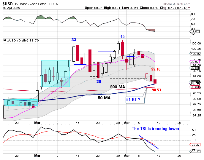 The dollar is now attempting to stabilize after an extended move lower, but remains under pressure following the breakdown. However, the dollar is stretched below the 10 day moving average and has begun to consolidate along the 200 day, which may allow the 10 day to catch up. If the dollar can break above 99.16, then a swing low would form. A close above the 10 day moving average would then be needed to confirm day 51 as the daily cycle low. If that confirmation occurs, then the dollar could resume its broader uptrend. If not, a break below 98.53 would extend the daily cycle decline and reinforce the shift in trend