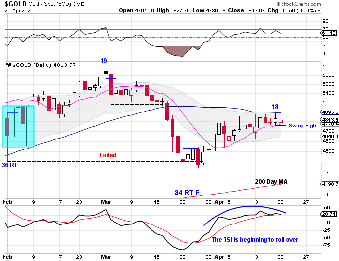 From a cycle perspective, gold formed a swing high on day 19, which begins to shift the structure toward a developing daily cycle decline. However, confirmation will be needed, as price is still holding above the 10 day moving average.