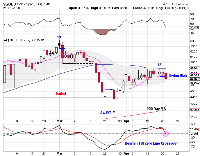 Gold formed a swing high on Monday and delivered bearish follow-through on Tuesday, closing below the 10 day moving average. This shifts the structure into a developing daily cycle decline.
