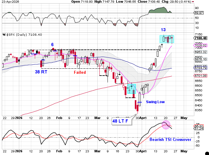 If stocks break out above the 7150 level, then it would indicate a continuation of the daily uptrend and signal a cycle band buy condition. If instead stocks pull back toward 7000 and successfully backtest that level with a close back above the 10 day moving average, then that would also support continuation of the uptrend and signal a cycle band buy condition.