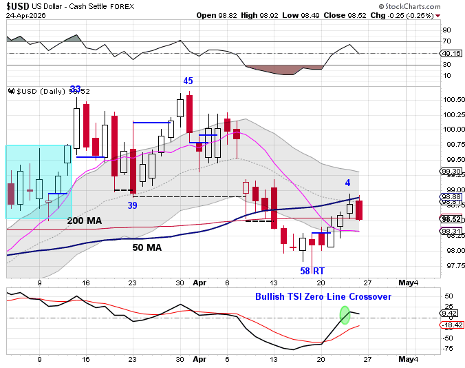 However, the cycle is still early following the day 58 low, and confirmation of continued downside will be needed. If the dollar continues lower and closes below the 10 day moving average, then it would indicate a continuation of the daily downtrend and signal a cycle band sell condition. If instead the dollar can reclaim the 200 day moving average, then the current move would begin to stabilize, with the 50 day moving average remaining as the next resistance level.